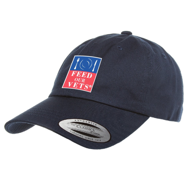 Cotton Twill Cap unstructured, adjustable cotton twill cap with front embroidered FEED OUR VETS® in black, khaki, light blue, navy. One Size.