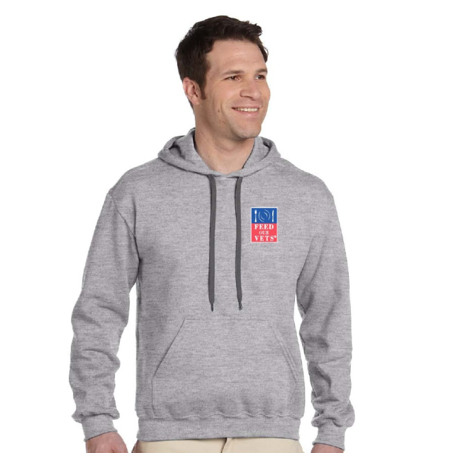 Hooded Sweatshirt with in black, sport grey, navy with embroidered FEED OUR VETS® logo on left chest. Mens Sizes S-3X.