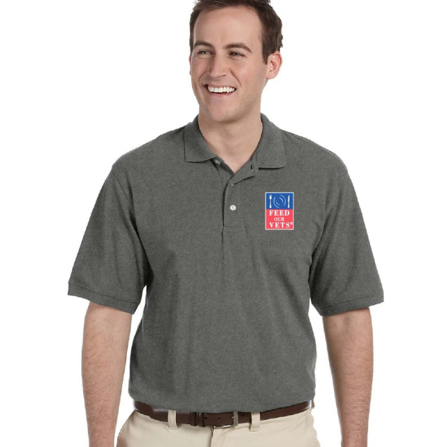 Poly/cotton pique short sleeve polo shirt with embroidered FEED OUR VETS® logo on left chest. In grey heather, black. Mens sizes XS-3X.