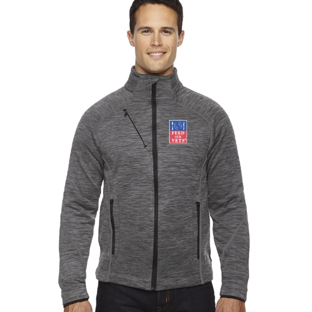 Bonded fleece soft shell jacket with embroidered FEED OUR VETS® logo on left chest. In carbon/black. Mens sizes S-3X.