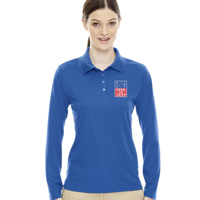 Performance long sleeve polo shirt with transfer FEED OUR VETS® logo on left chest. In royal, white. Ladies sizes XS-2X.
