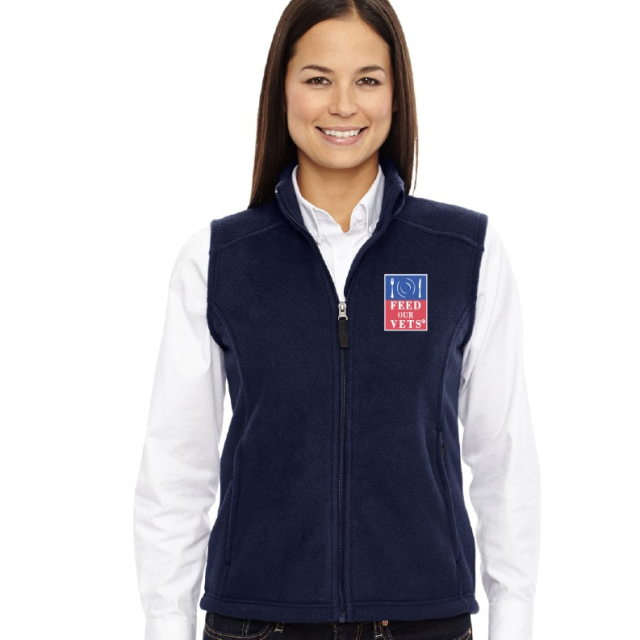 Full-zip fleece vest with embroidered FEED OUR VETS® logo on left chest. In classic navy, heather charcoal. Ladies sizes S-2X.