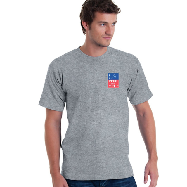 USA made short sleeve cotton tee shirt with FEED OUR VETS® logo transfer on left chest. In bayside navy, dark ash. Mens sizes S-2X.